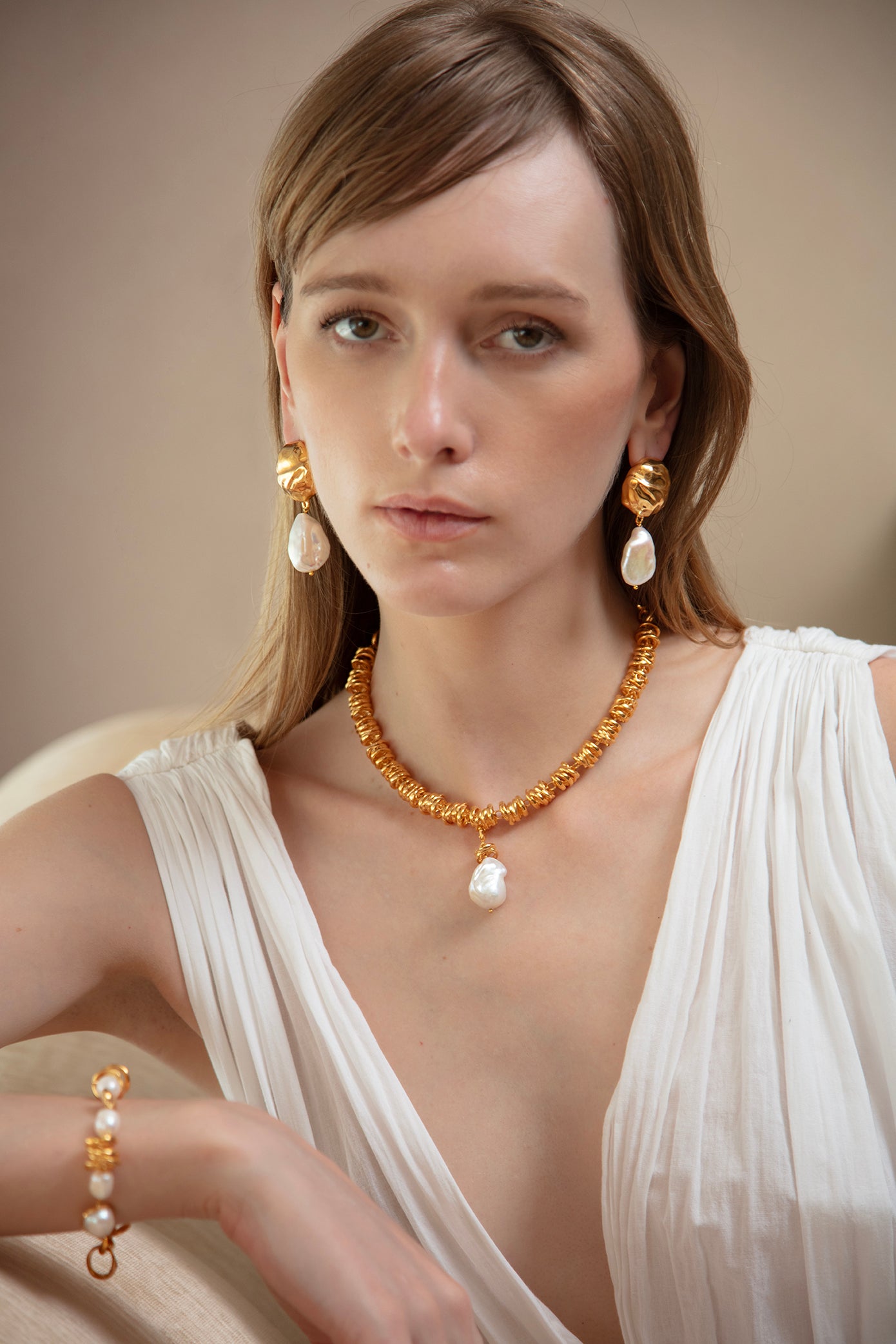 and raw. The collection consists of statement pieces, featuring textured gold encrusted with stones and cultured pearls creating a union celebrating nature and femininity.
