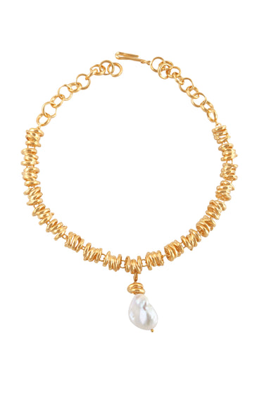 A layered wave-link chain necklace finished with a pearl pendant for a modern yet elegant touch.