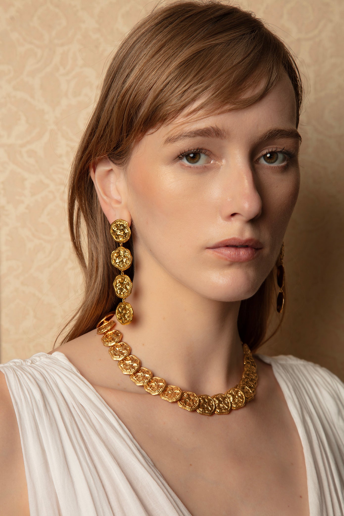 A bold yet feminine piece featuring a sculptural wave-textured coin pendant that catches the light beautifully. Modern, elegant, and easy to style, it adds a refined touch to both everyday looks and elevated outfits.