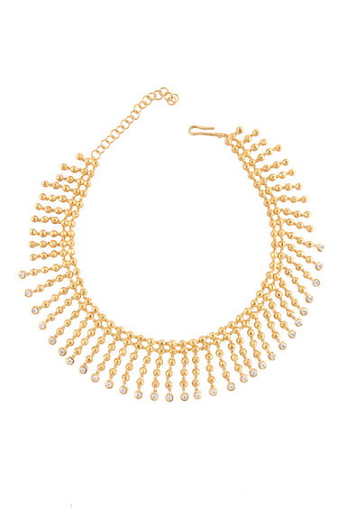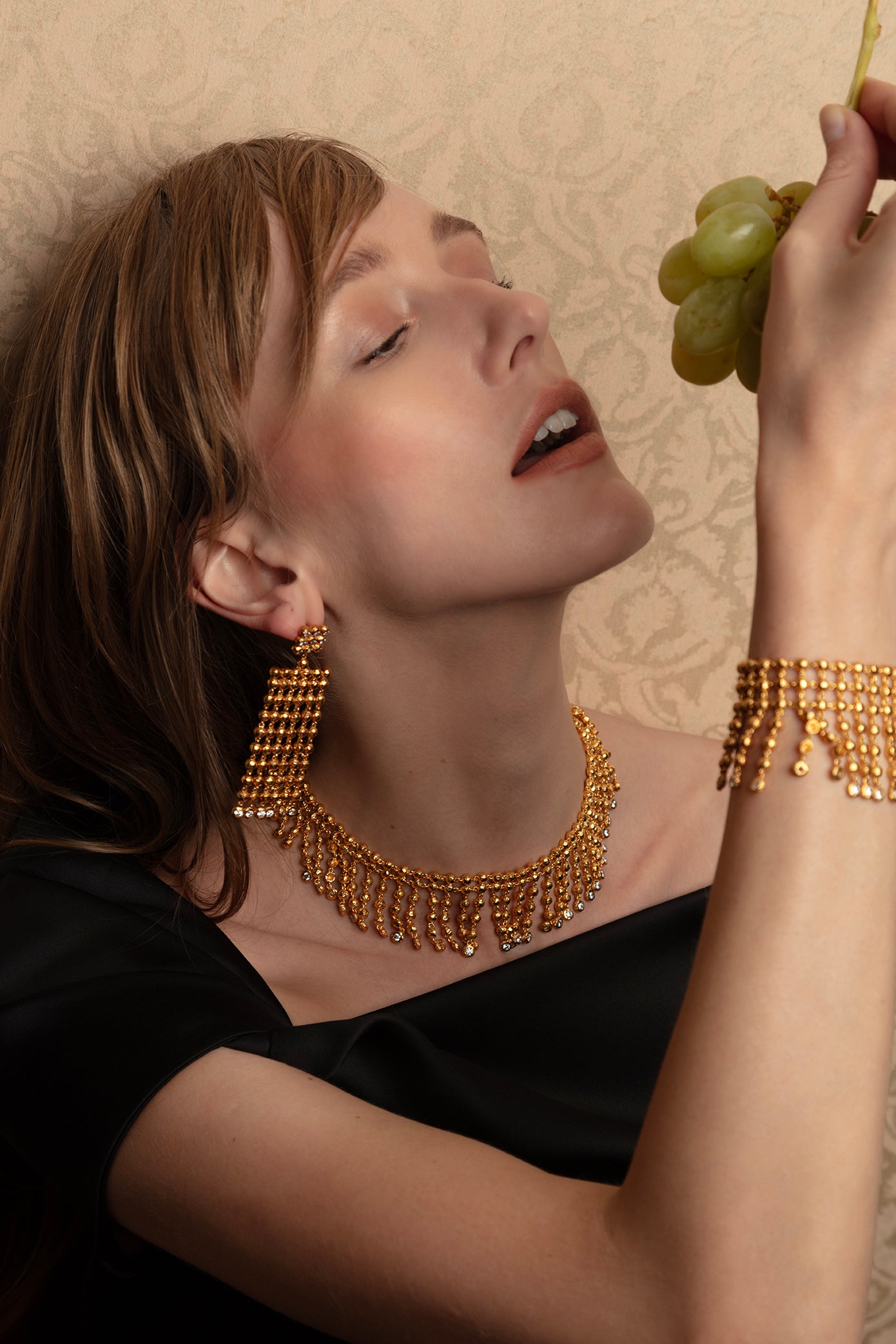 A striking fringe necklace featuring handset stones that catch the light with every move.