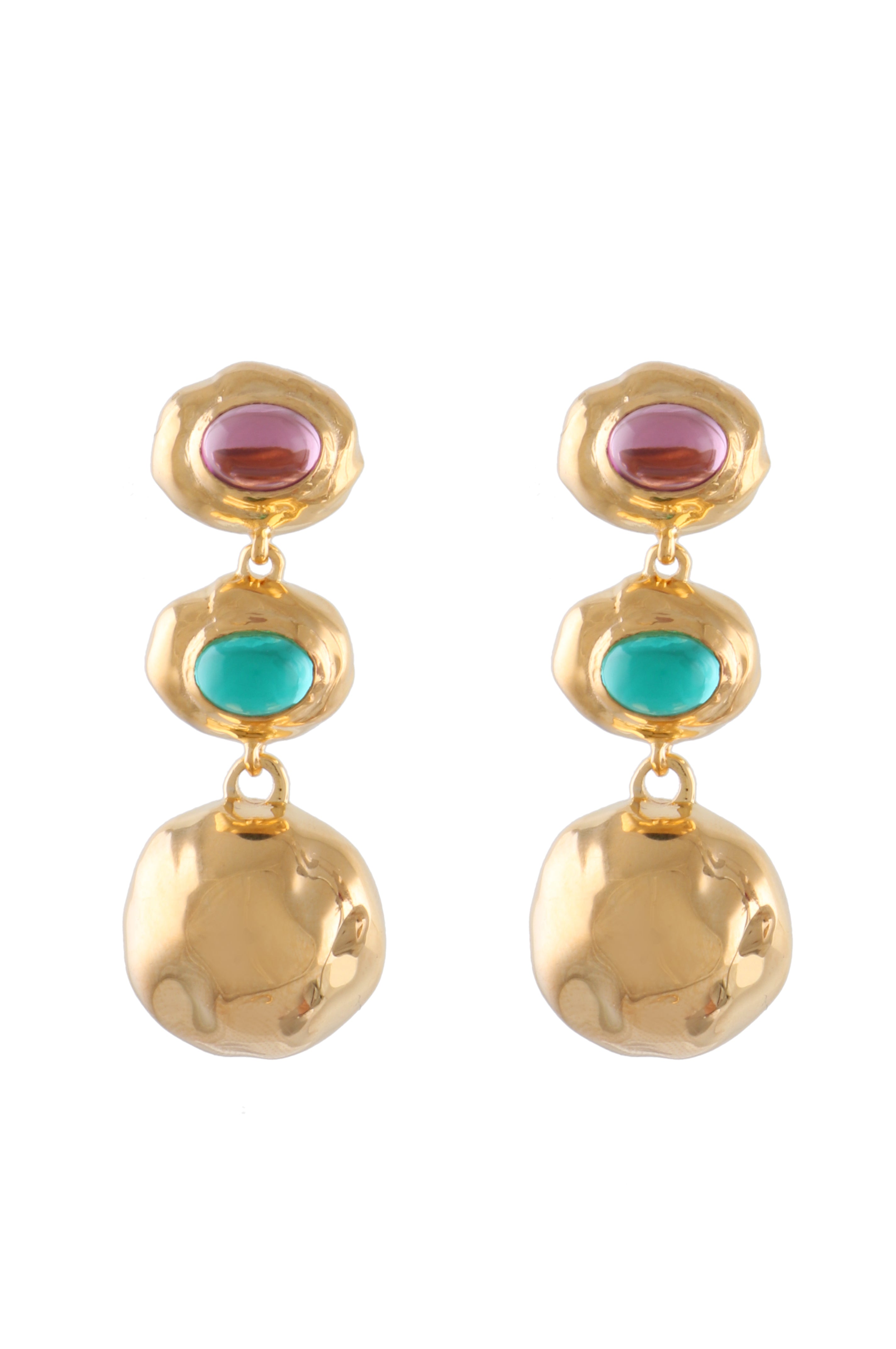 Gold plated dangling earrings with oval cabochon stones, designed for elegant movement and timeless appeal.
