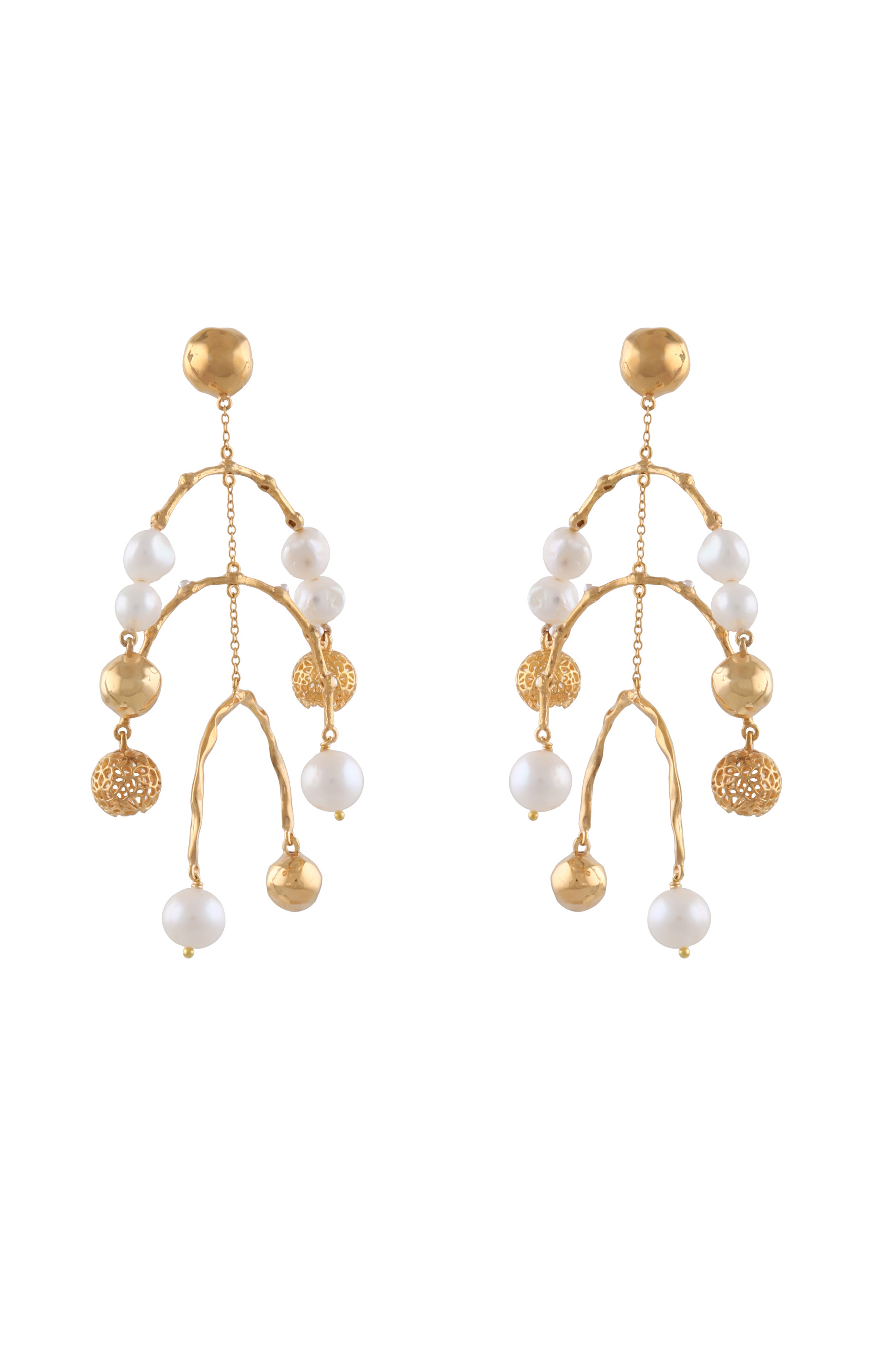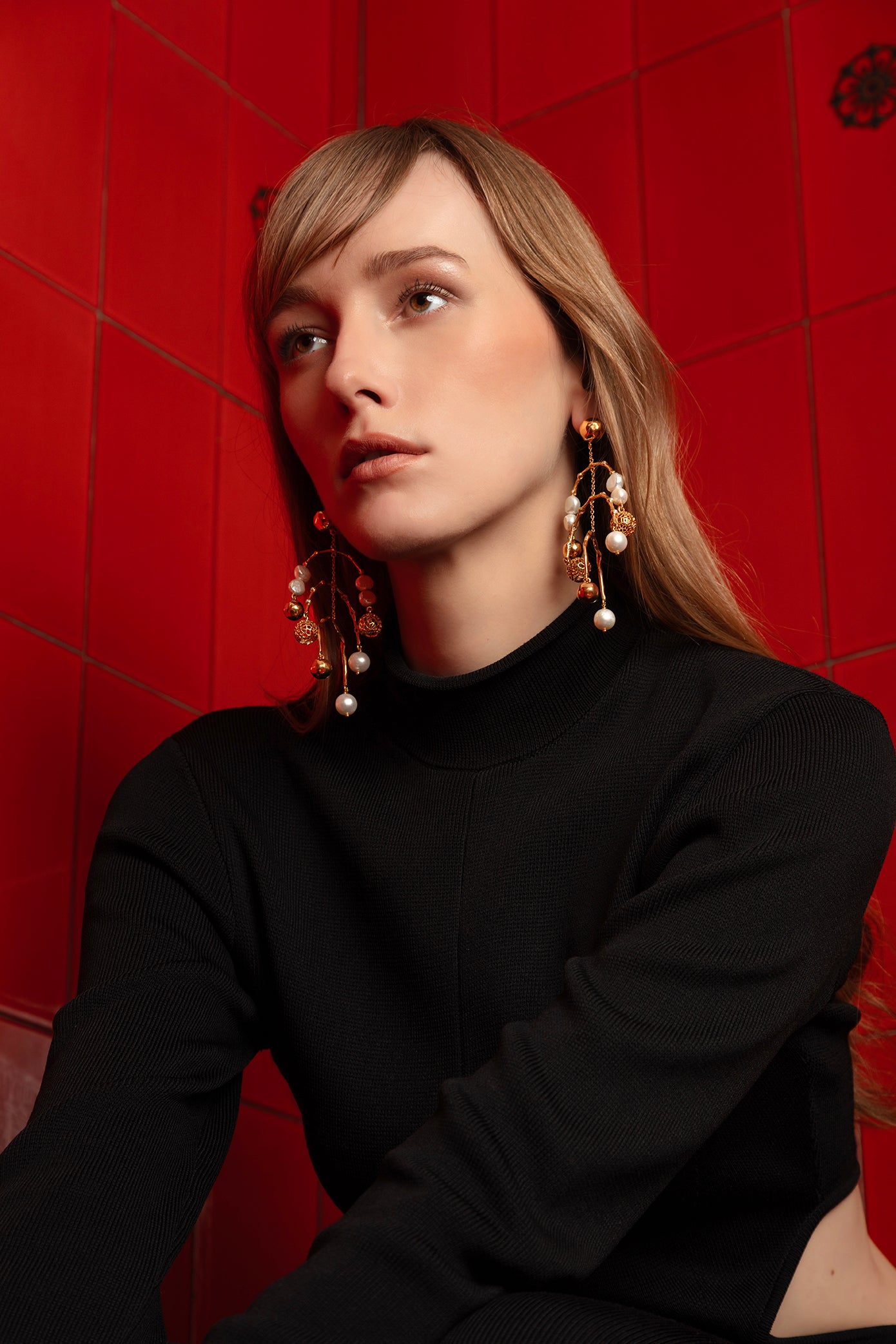 STATEMENT EARRINGS WITH DANGLING ORBS AND PEARLS