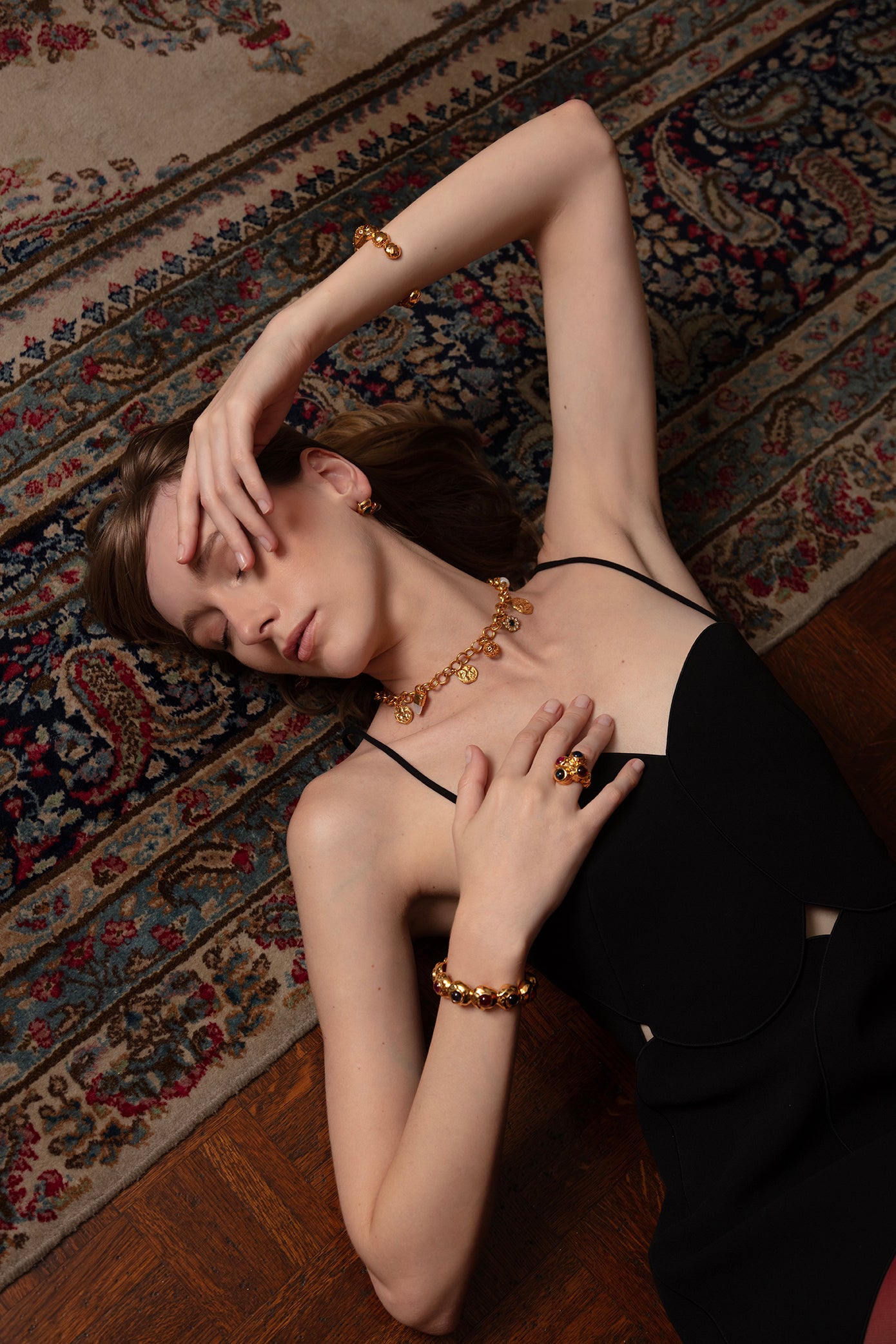 and raw. The collection consists of statement pieces, featuring textured gold encrusted with stones and cultured pearls creating a union celebrating nature and femininity.