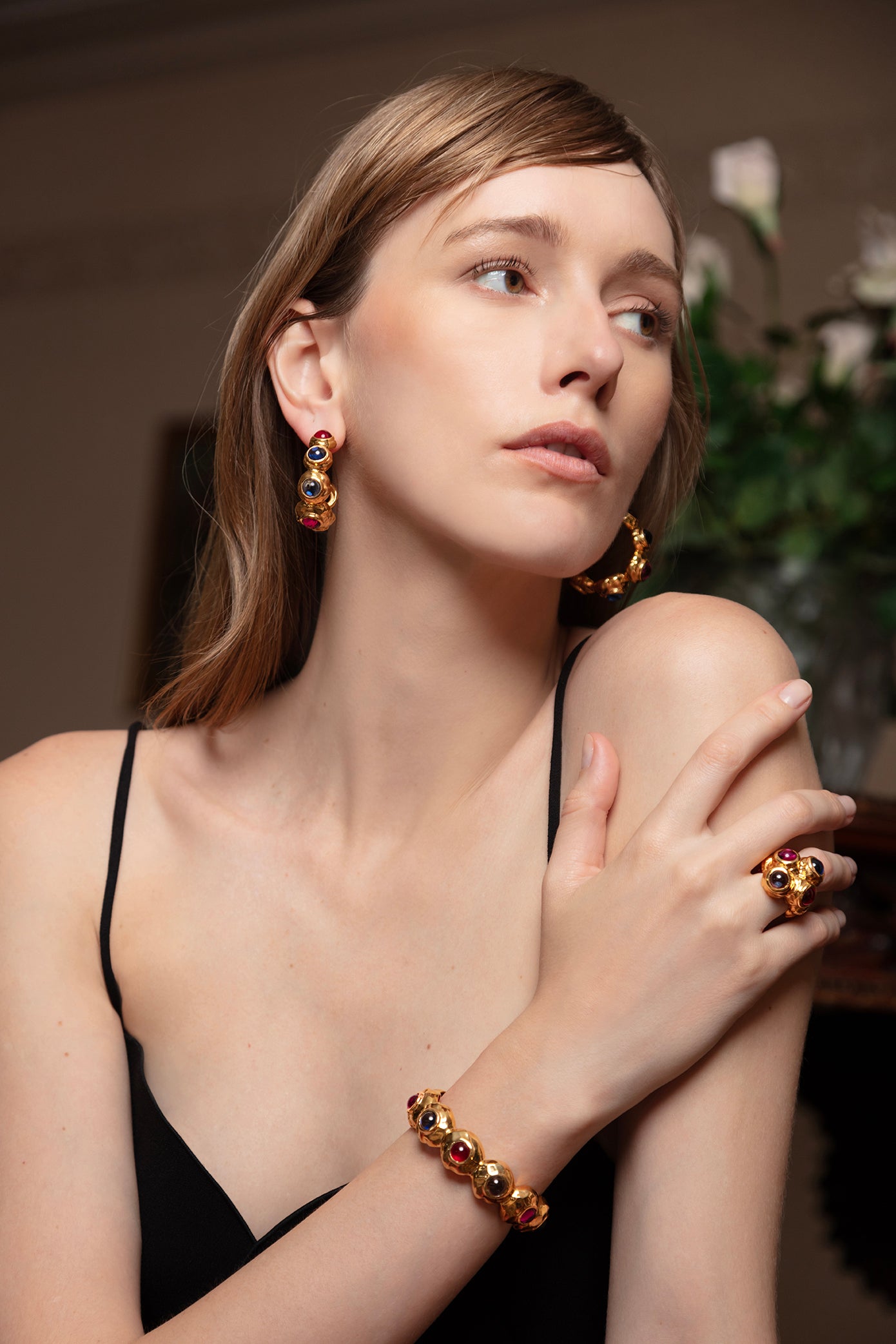 A bold statement piece featuring smooth, multicolored cabochon stones set in flowing gold-toned curves.